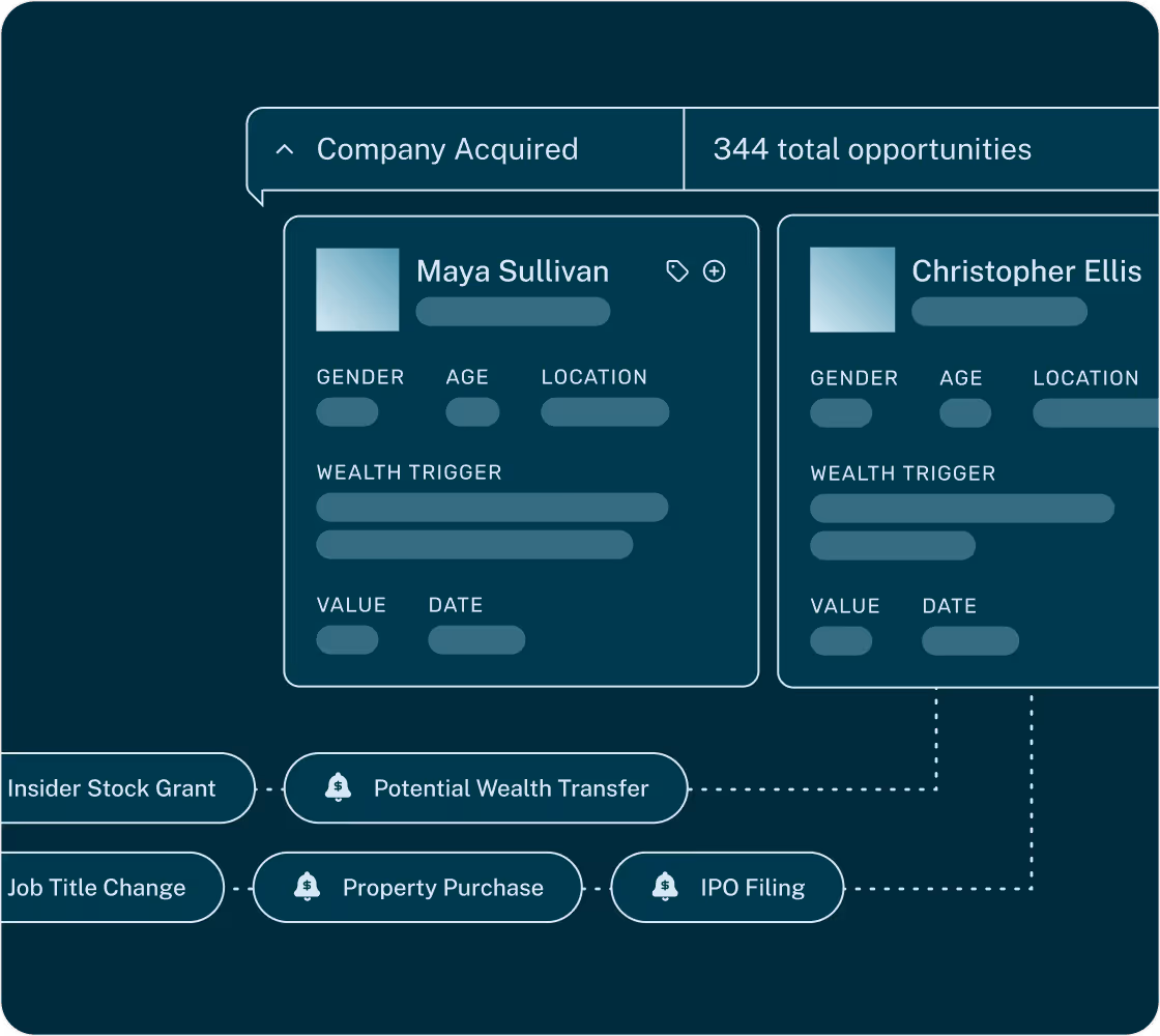 Aidentified’s DaaS streamlines strategic decision-making and boosts operational efficiency. Our first-party data enrichment sharpens customer profiles for better targeting, improved ROI, and optimized campaigns. Advanced search tools speed up lead generation, while timely wealth triggers reveal key opportunities. Paired with powerful relationship intelligence, teams gain access to warm connections, accelerating and enhancing the sales process.